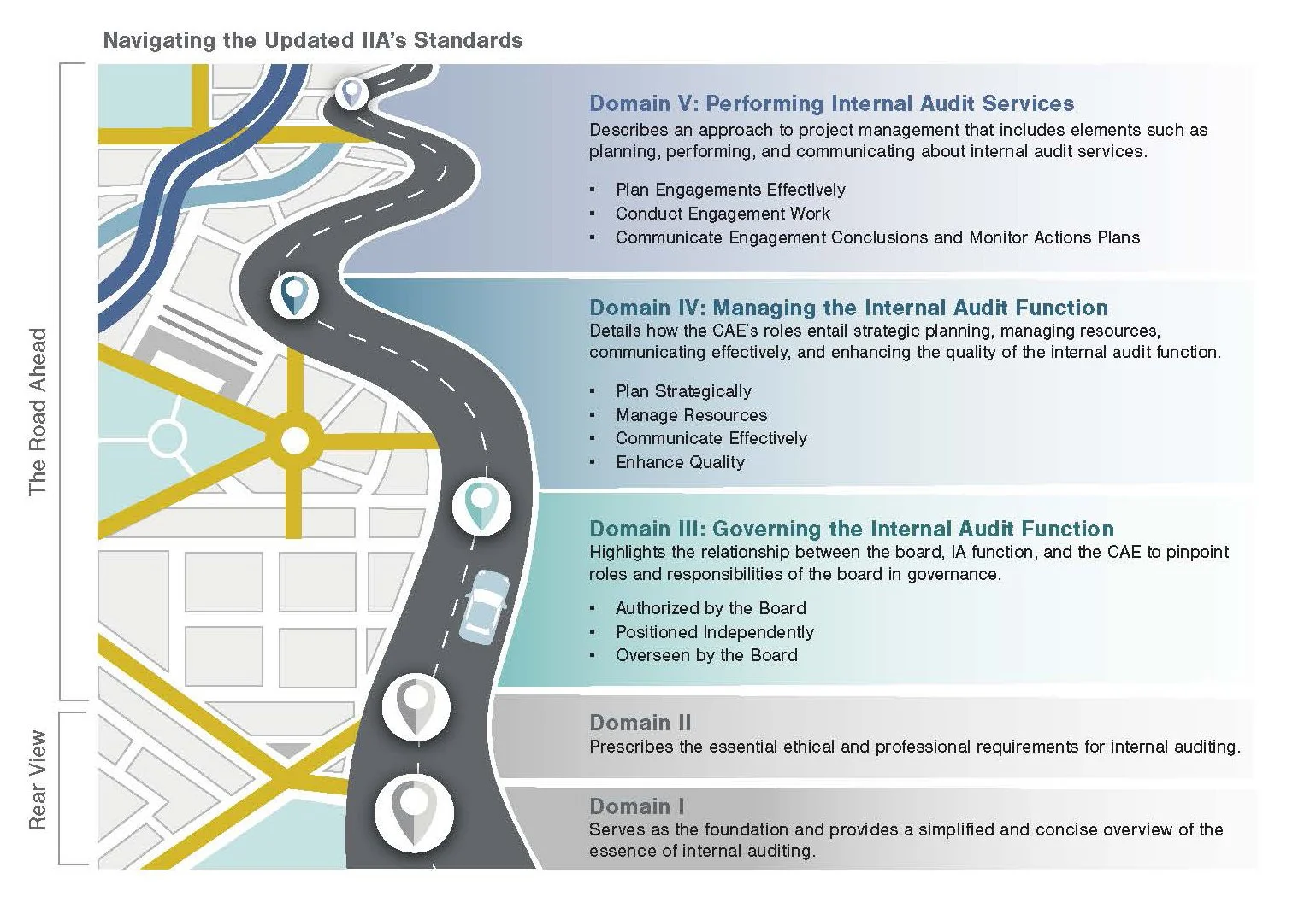 This layout was developed based on the customers need to illustrate a distinction between the way the team worked in the past (domains 1-2) versus new explorations (domains 3-5). They wanted to use a theme associated with navigation to tell the story.